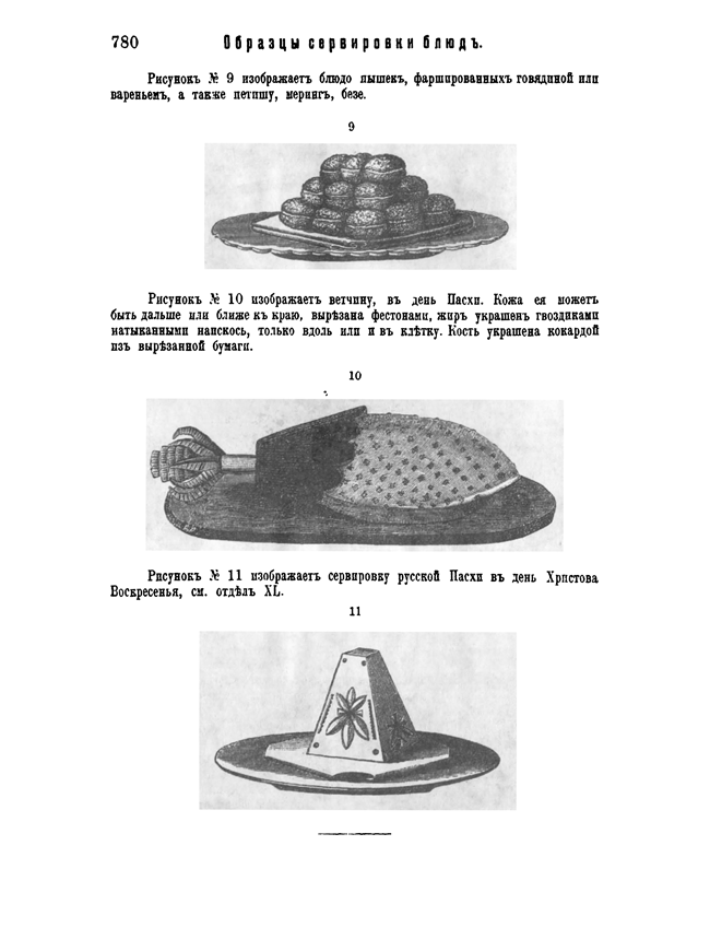 Образцы сервировки блюд. Рисунок №9. Блюдо пышек, фаршированных говядиной или вареньем, а также петишу, меринги, безе. Рисунок №10. Ветчина в день Пасхи. Рисунок №11. Сервировка русской Пасхи в день Христова Воскресенья.