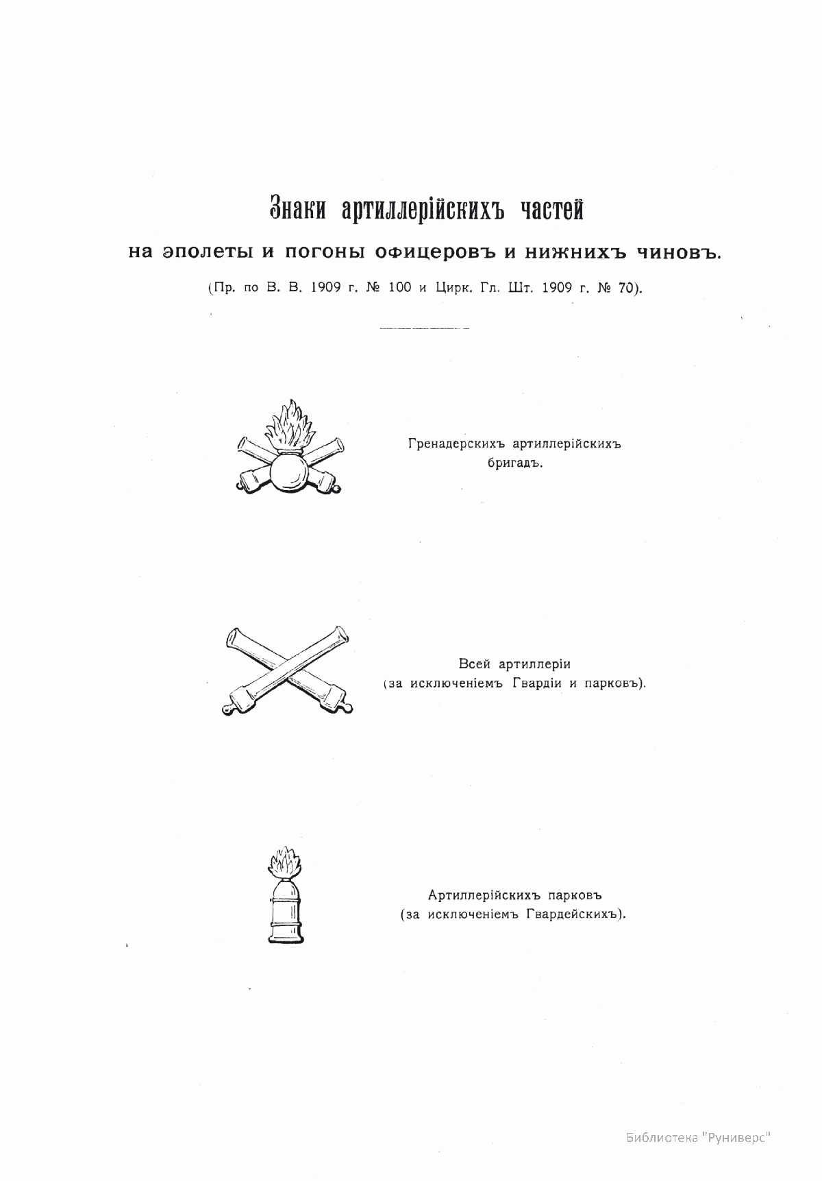 Знаки артиллерийских частей на эполеты и погоны офицеров и нижних чинов.