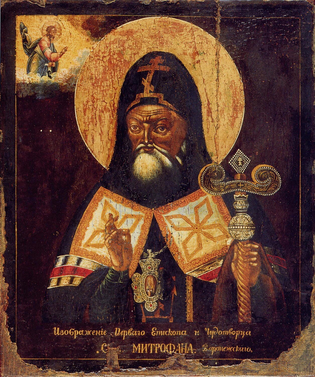 В «Акте освидетельствования мощей» святого сохранилось описание одеяния: святитель Митрофан был облачен в схимнический куколь и архиерейскую мантию, на груди - крест. Именно такой тип изображения святителя, соединивший образ его служения при жизни и высший монашеский подвиг, с которым он окончил свой земной путь, был положен в основу иконографии и стал наиболее распространенным. Об этом свидетельствуют многочисленные иконы и гравюры, созданные сразу после канонизации. Чин схиепископа, в котором представлен святитель Митрофан, не встречается в изображениях святых ХVШ-ХIХ вв. На иконе вверху изображен благословляющий Спаситель в облаках. В лике святителя выражены характерные портретные черты. В руках его жезл с большим, богато украшенным навершием. Эта деталь, повторяющаяся на многих иконах, связывается с жезлом, хранившимся в ризнице Митрофанова Благовещенского монастыря. По преданию, которое, однако, не подтвердилось исследователями начала XX в. (Н.И.Поликарпов), это подлинный жезл свт. Митрофана.