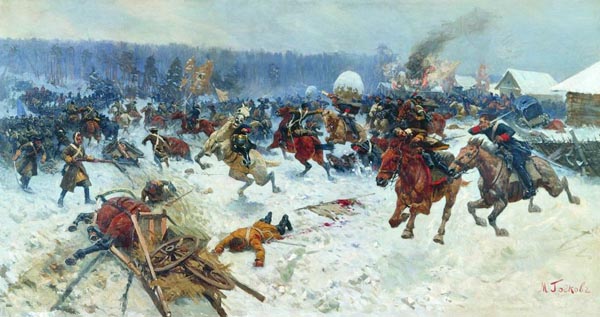Атака шведов ярославскими драгунами у деревни Эрестфер 29 декабря 1701 года. М.Б.Греков. 1914 год