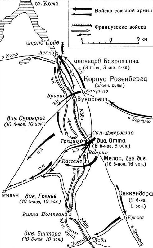 1799 год. 26 апреля (15 апреля ст.ст.) начинается битва на реке Адда, в ходе которой войска генерал-фельдмаршала А. В. Суворова разбили французскую армию генерала Ж. Моро.
