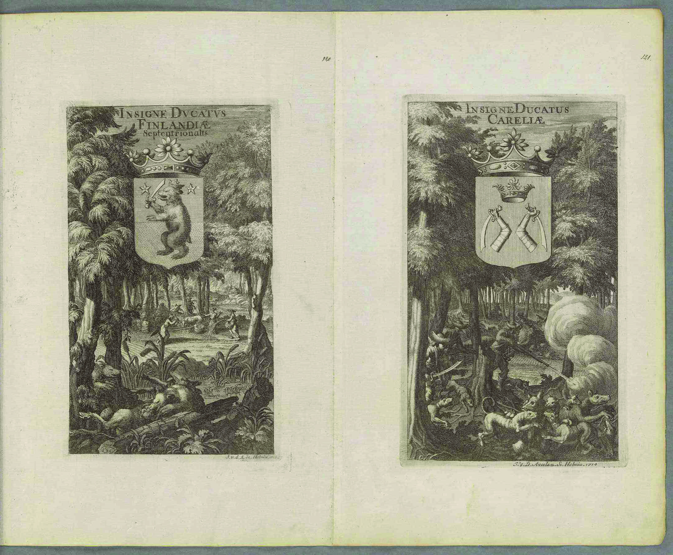 Гербы великого княжества Финляндии и трех княжеств Финляндии: Южная Финляндия (Finтlandia Meridionalis), Северная Финляндия (Finтlandia Septentrionalis) и Карелия 1