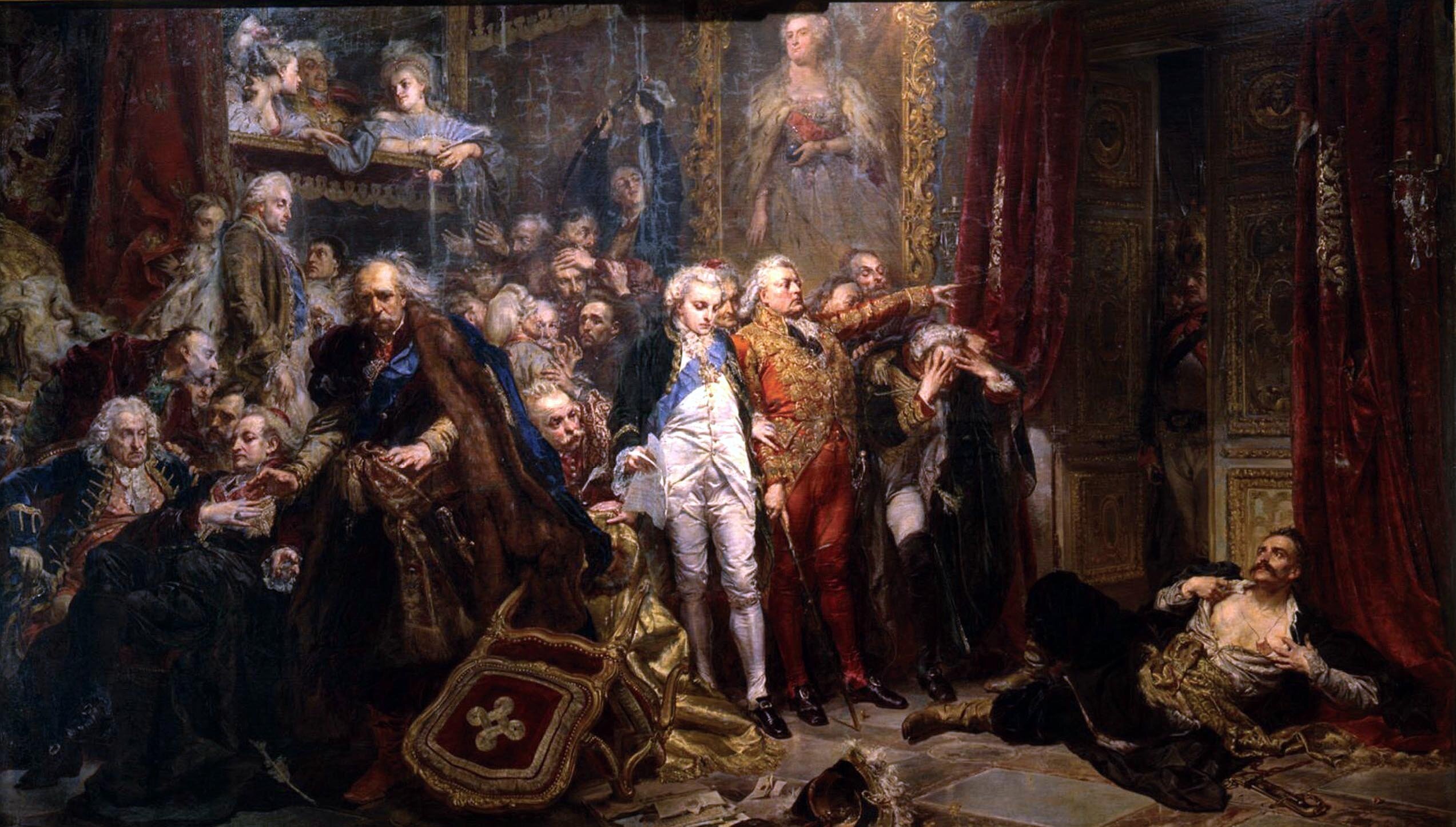 Над всей мизансценой высится портрет русской императрицы Екатерины II с державой в руке. Однако слева от портрета императрицы Матейко изобразил молодого человека, в правой руке которого зажата сабля в ножнах, а в левой конфедератка. Этот молодой человек — Самуил Корсак, активный сторонник Рейтана, будущий участник восстания, который погиб при штурме Праги, символизирует надежду на освобождение Речи Посполитой.