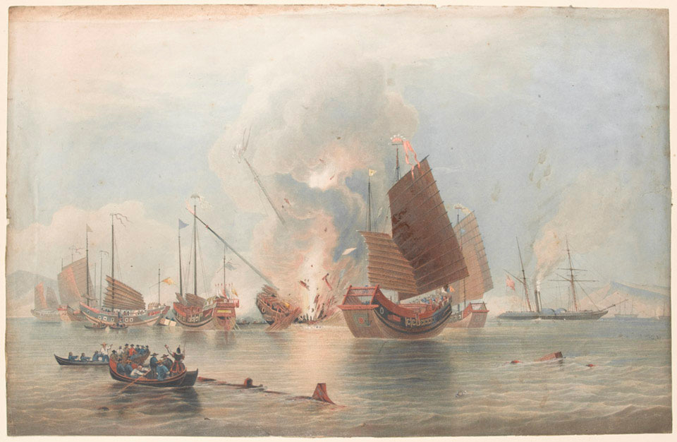 Броненосец Британской Ост-Индийской компании HEIC Nemesis уничтожает китайский флот 7 января 1841 г. около фортов Чуаньби, перекрывавших путь к Гуанчжоу по реке Чжуцзян. Работа британского акварелиста Эдварда Дункана (Edward Duncan), 1843 г.