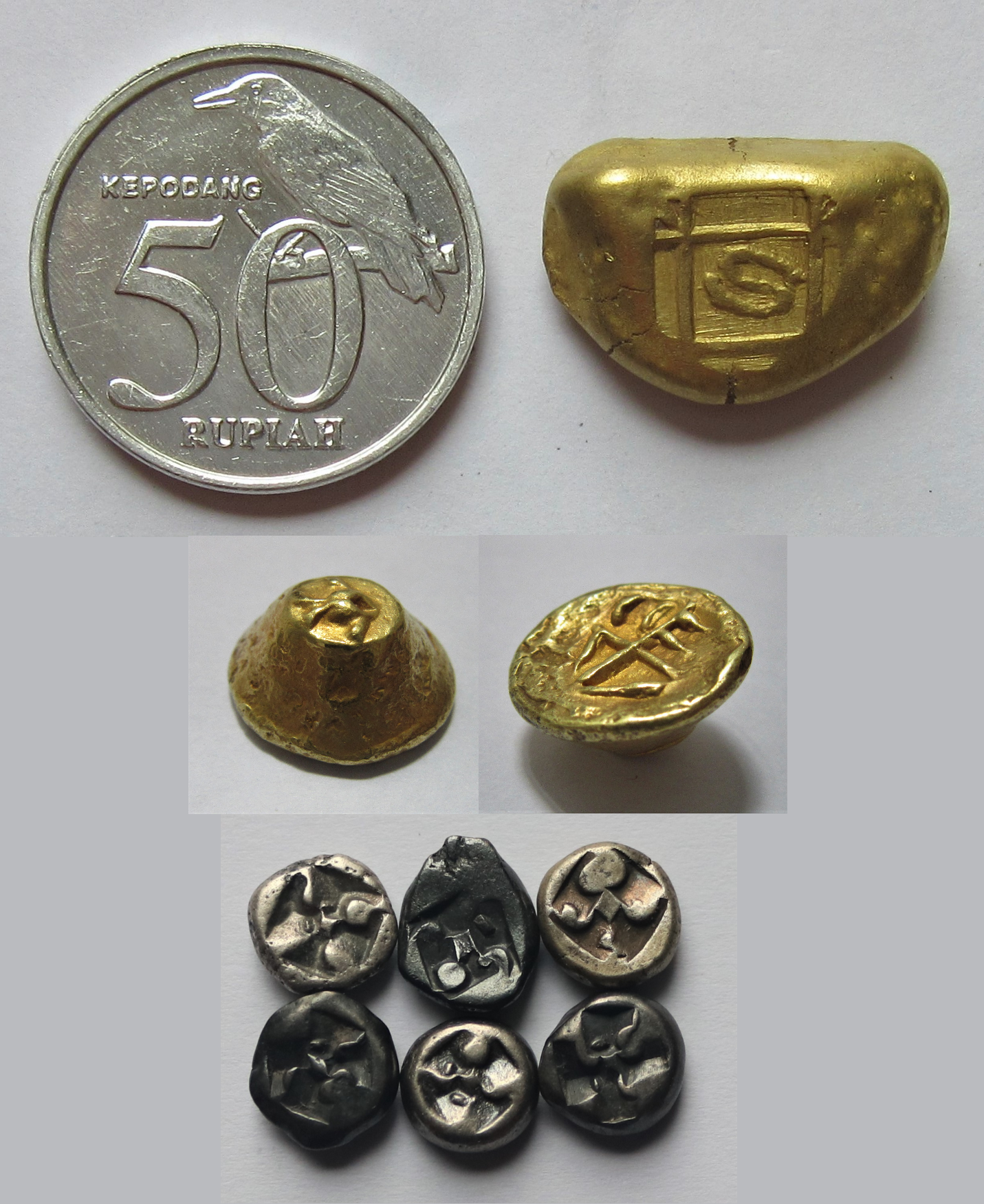 Сверху вниз - золотые 1/2 тахила (11,94 гр), золотой слиток в 3,5 маса (8,54 гр) и монетки с цветком сандала в 1 маса (2,4 - 2, 6 гр).