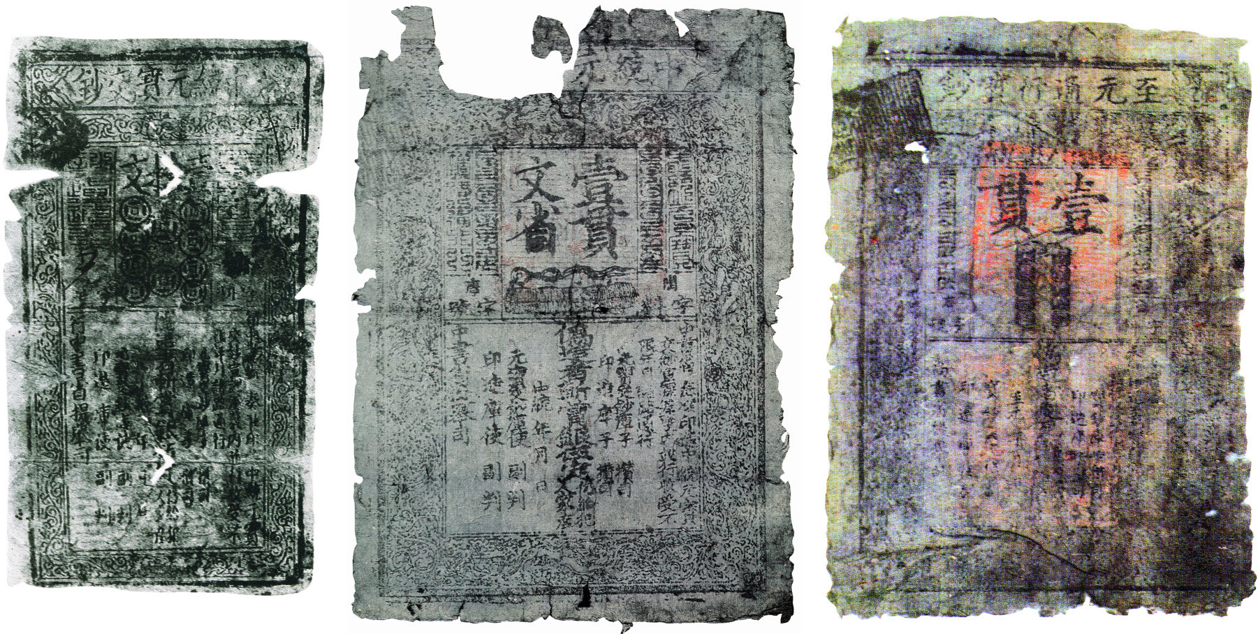 Как правило, имеют печальную сохранность, кроме того, все они находятся в музеях Китая, Монголии и Росиии и никогда не выставлялись на аукционах. Слева направо; раскопки в Хара-Хото 1982 г. выполненные The Relics Administrative Office of Huhehoto of Inner Mongolian Autonomous Region, банкнота в 10 связок монет, второй выпуск, 1311 г. размер 100х175 мм. Банкнота в 1 связку, 1260 г., извлечена во время раскопок в Сянъяне, провинция Хубей, сейчас находится в Историческом музе провинции Шэньси. Банкнота в 1 связку, выкопанная The Relics Administrative Office of Huhehoto of Inner Mongolian в руинах Хара-Хото.