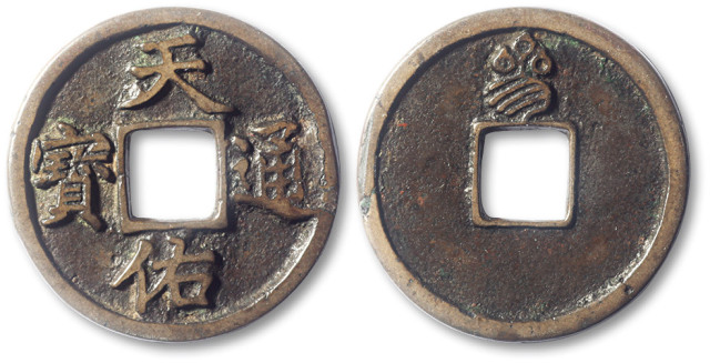 Tiānyòu tōngbǎo (天祐通寶) выпущенные еще одним варлордом времен падения Юань - Чжан Шичэном, ненадолго провозгласившим Великое Чжоу. На реверсе стилизованный знак «три», диаметр: 33,9 мм, продано за 3400$ в мае 2018 на Huaxia Ancient Spring. Аналогично, существовали разные номиналы - 1, 2, 3, 5 вэнь. Утверждалось, что эти монеты отлиты из большого бронзового Будды храма Чэнтянь в префектуре Лунпин (сейчас город Сучжоу), после того, как Чжан Шичэн захватил Пинцзян. Естественно Чжу Юаньчжан приказал переплавить все найденные монеты повстанцев, так что осталось их очень мало. По цене, кстати, с ними что-то странное. В некоторых источниках приводятся какие-то смешные цифры, как выше - порядка 1500-4000 долларов, в других же приводятся проходы по 260, 400 и ужасающие 700 тысяч долларов. Эти цены смотрятся как-то логичнее.