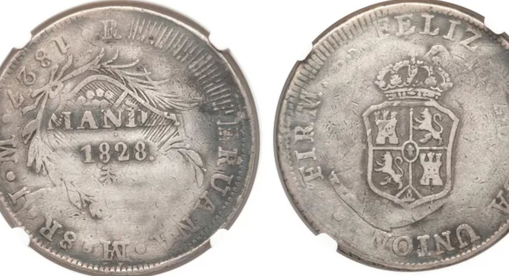 Манила была настоящим магнитом для серебряных монет со всей Латинской Америки, здесь можно было найти деньги Мексики, Боливии, Перу — такие, как эти 8 перуанских реалов 1827 г. проштампованные надписью MANILA 1828. Перу в те годы уже была республикой и использование этих денег в нетронутом виде кажалось испанцам омерзительным, однако, операция по перечеканке фактически провалилась из-за неисправных прессов Манильского монетного двора. Перечекан вышел довольно слабым, даже герб республики до конца не сбился, в результате уже в 1830 перечеканку прекратили, а с 1832 г. стали набивать только маленькую контрмарку. Монета довольно редкая, продана за $1300.
