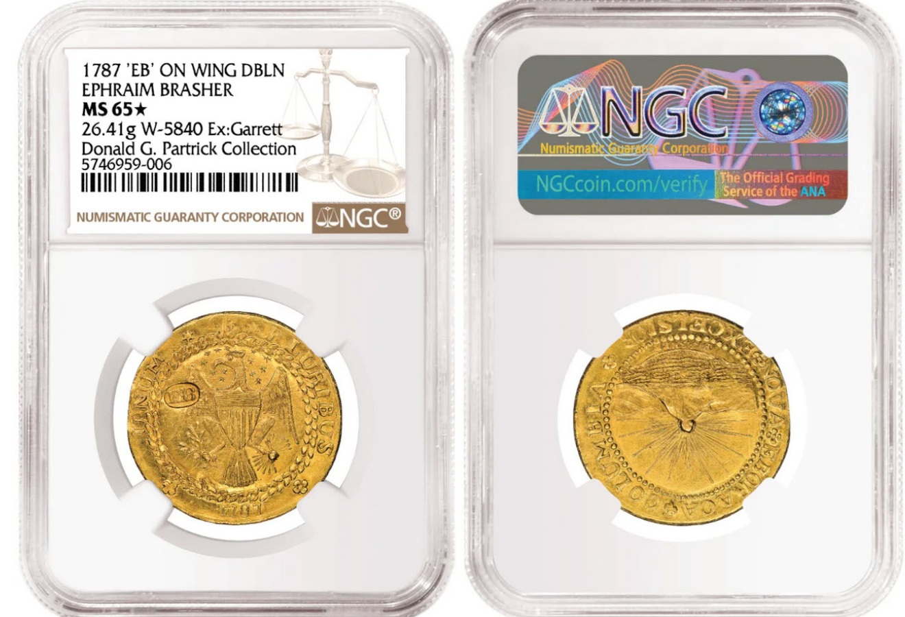 История США знает немало невообразимо дорогих монет, особенно, отчеканенных в XVII — XVIII вв. Американские нумизматы — люди страстные и чудовищно богатые, в результате за их раритеты на аукционах разгораются непредставимые побоища. На фото — не нуждающийся в представлении дублон нью-йоркского ювелира Ефраима Брашера, отчеканенный им по собственному дизайну и собственному почину в 1787 г. в количестве менее 10 экземпляров. Номинальная стоимость дублона его работы — 8 эскудо или 16 серебряных испанских долларов. Корректнее назвать его «дублоном восьмушки» (doubloon of eight), так как обычный дублон имел номинал в $4.