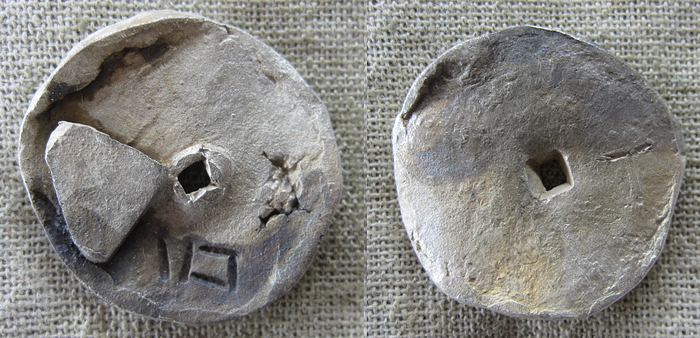 Японская прото-монета из серебра Mumon-ginsen (無文銀銭), дословно —«серебряная монета без надписи», около 665–672 г.