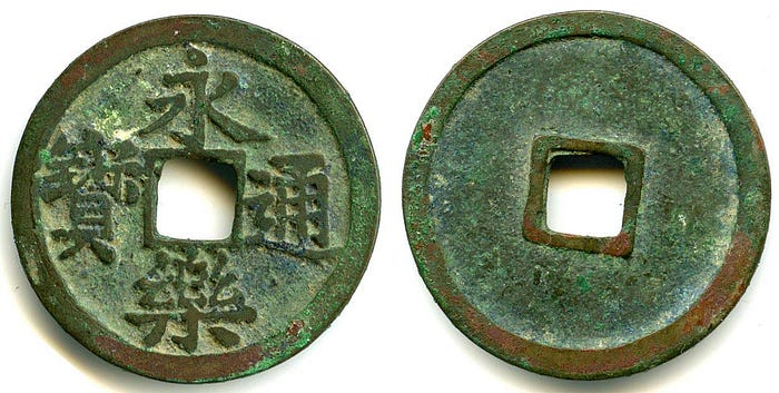 Yǒnglè tōngbǎo (永樂通寶) отливались с 1408 по 1424 и не являются очень редкими.