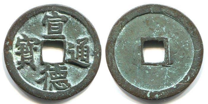 Xuāndé tōngbǎo (宣德通寶) выпускались всего с 1433 по 1435 и считаются редкими.