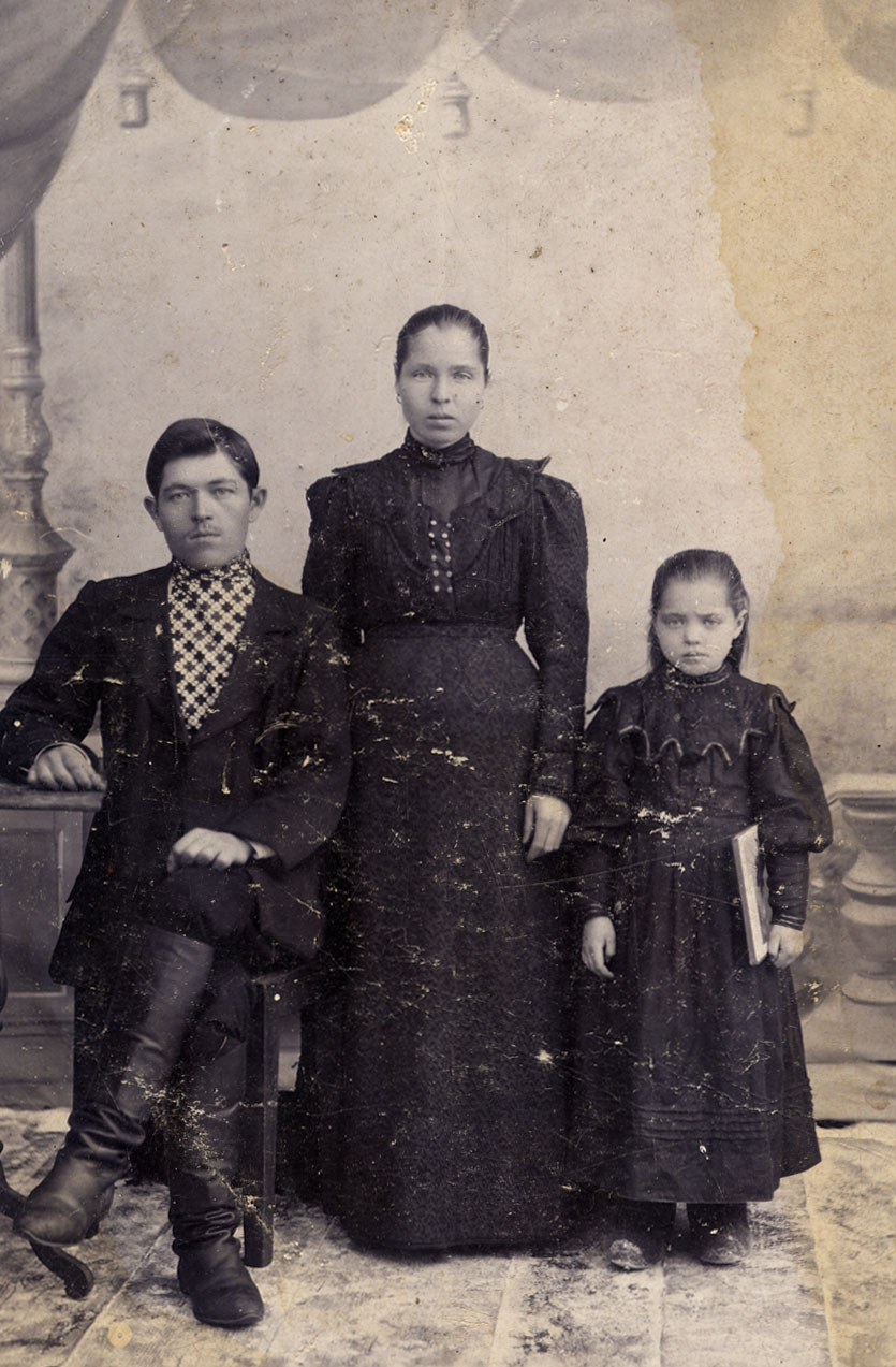 Неизвестный фотограф. Портрет семьи Калмыковых - Ивана Дементьевича, Татьяны Дмитриевны и их дочери Маши. 1900-е г.