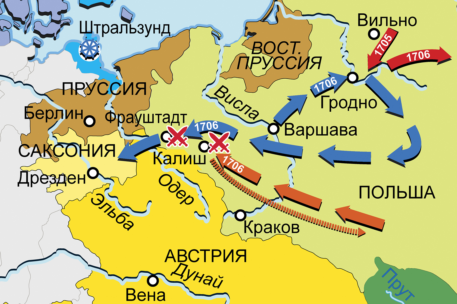Карта кампаний 1705–1706 гг. Действия в Польше и выход Саксонии из войны (Великая Северная война 1700–1721 гг.)