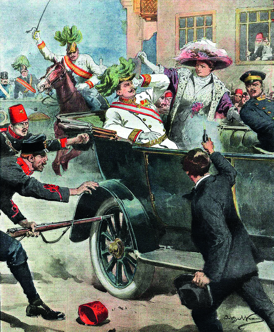 Гаврила Принцип убивает наследника австрийского престола эрцгерцога Франца Фердинанда и его супругу герцогиню Софию. Иллюстрация из Le Petit Journal, 12 июля 1914 г.