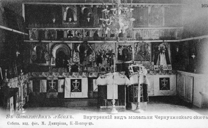 «В Заволжских лесах. Внутренний вид молельни Черну-хинского скита». Чернухинский скит. Внутренний вид мо-лельного дома с иконостасом. б/д