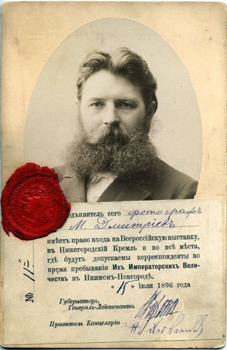 Пропуск на ВПХВ на имя М.П. Дмитриева. Н.Новгород, 1896 г.