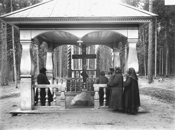 Внутренний вид часовни и камня в Саровском лесу, на котором молился отец Серафим.
