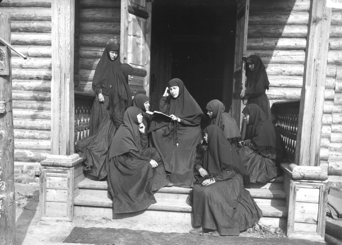 Группа монахинь на паперти Никольской церкви. Село Подлесово.