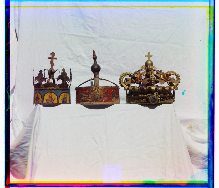 Древние брачные венцы: железный (XVII), лубочный (XVI) и резной из дерева вызолоченный (XVII).