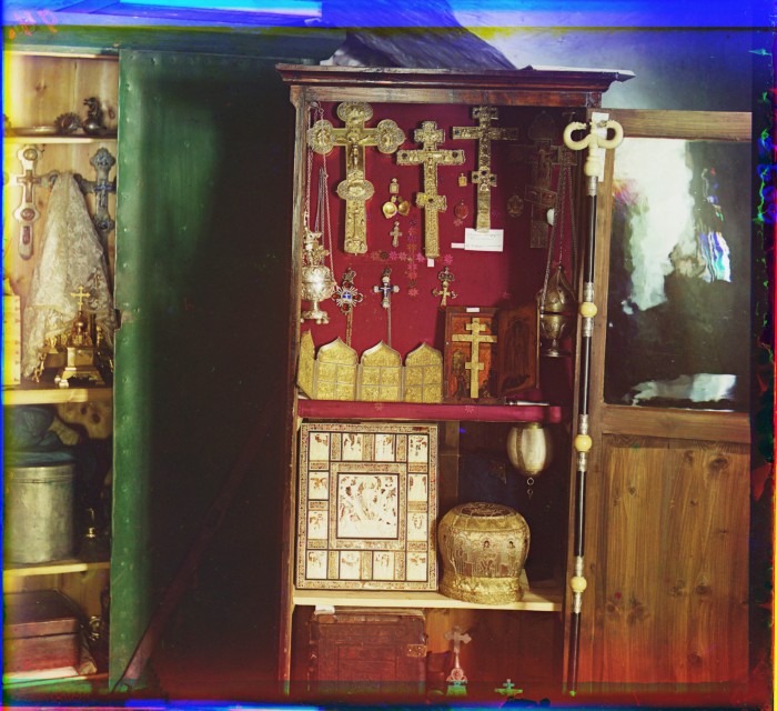 [1910]. Успенский Старицкий монастырь. Некоторые предметы из ризницы монастыря: митра, кадило и крест св. Дионисия, крест патриарха Иова.