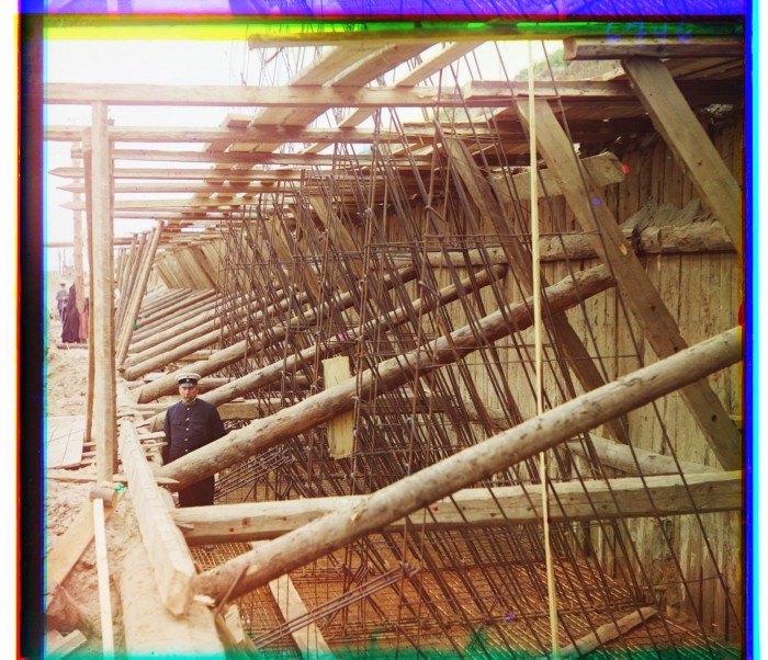 1912. Село Белоомут на реке Оке. Плетение железо-бетонной арматуры для стенок шлюза на реке Оке. <p/> <p/> Фотография вошла в альбом «Российская Империя в цвете, 1909-1915, Владимирская и Ярославская губернии».