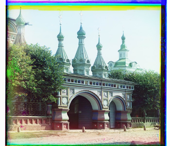 [1910]. Вход в церковь Воскресения на Дебре (1652). На входе - лев с единорогом. [p] Построена купцом Исаковым, обнаружившим среди партии товара из Англии бочонок с золотом. Оповещенные владельцы товара сказали, что это жертва на дела благочестия. Так лев и единорог с герба Англии оказались на входных вратах церкви в Костроме.