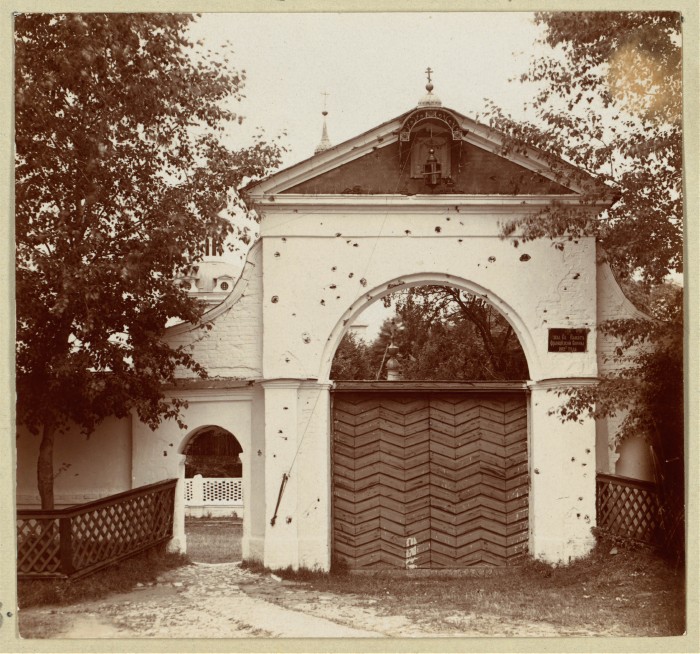 1912. Мало-Ярославец, мужской Черноостровский монастырь. Входные врата, избитые французскими пулями. Надпись: "Язвы в память французской войны 1812-го года". Отметины от пуль оставлены для того, чтобы подчеркнуть, что в икону Спасителя на вратах не попала ни одна пуля, несмотря на то, что 11 октября 1812 г. город 8 раз переходил из рук в руки.