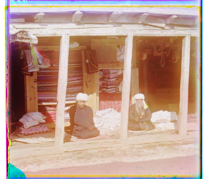 Самаркандская область. Самарканд. Торговцы материями на Регистане.