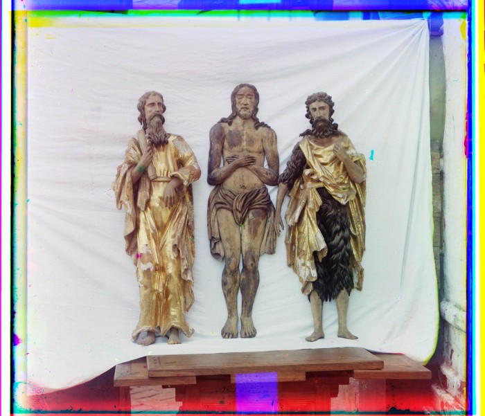 Резные изображения Иоанна Богослова, Христа и св. Иоанна Предтечи.