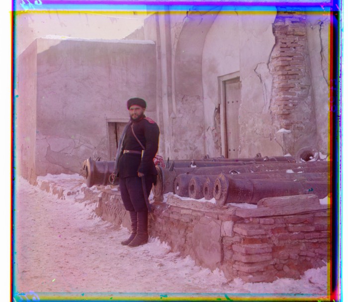 Бухарское ханство, г. Бухара. Часовой у дворца и старинные пушки.