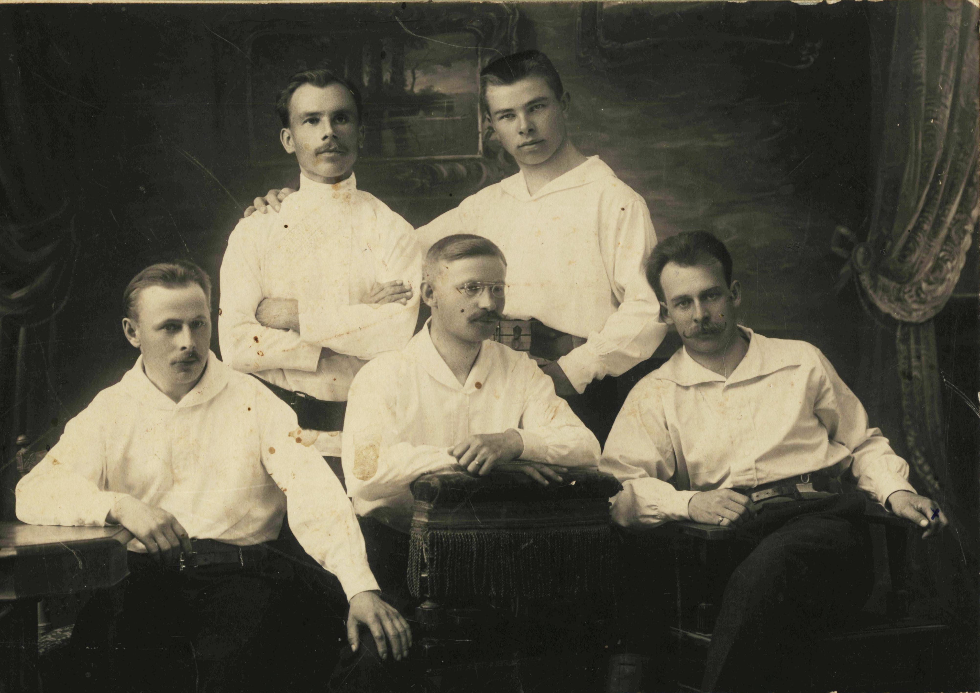 Фотоателье Н. Сажина, Муром. Групповой портрет молодых людей. Стоит справа А.Ф. Жадин – предприниматель, коллекционер, один из организаторов муромского музея. 1908 – 1910. Архив Масленниковых.