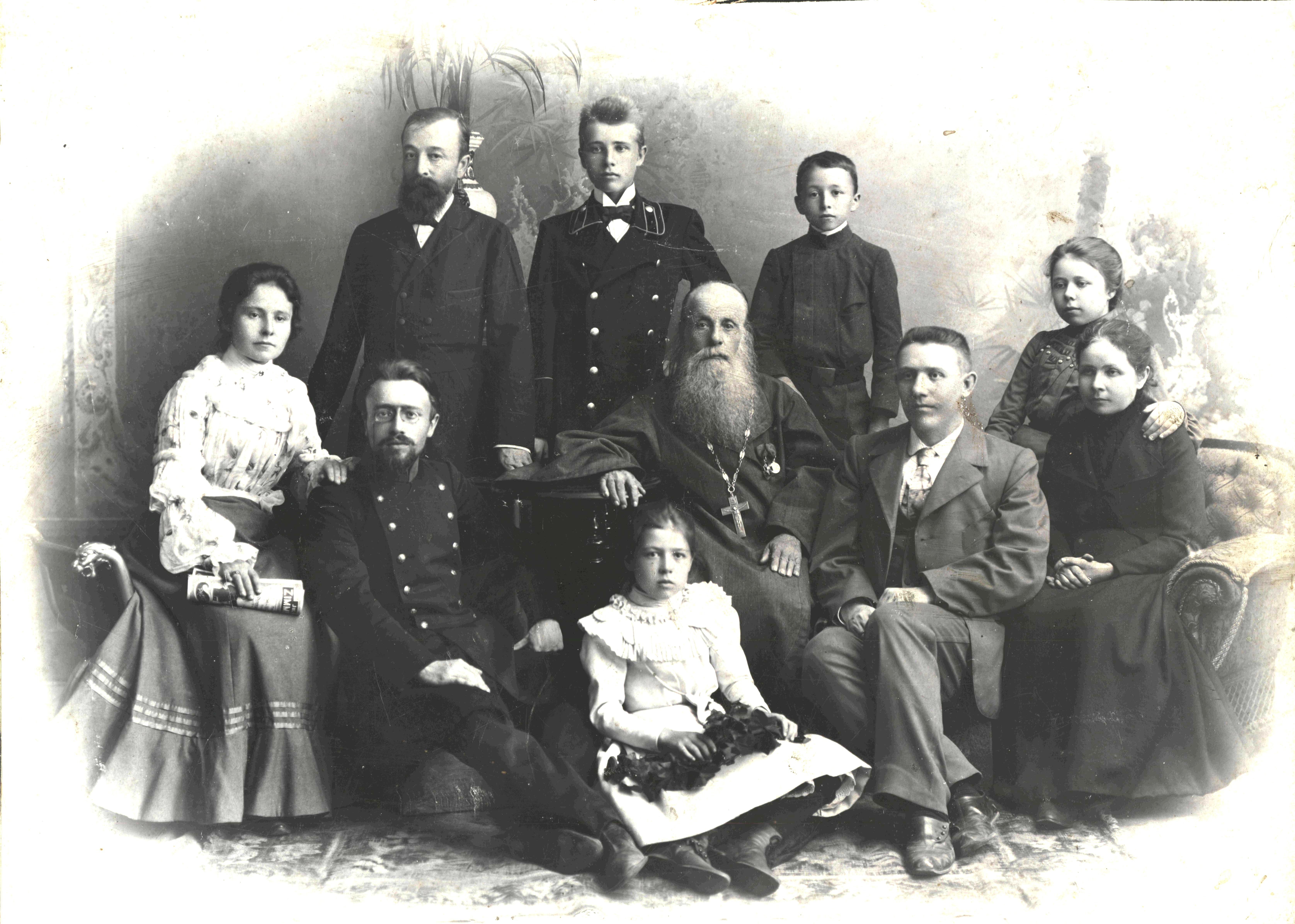 Групповой портрет семей Смирновых, Орловых, Сокольских. В центре – И. А. Смирнов – протоиерей Николо-Зарядской церкви. Муром. Архив Дюминых.