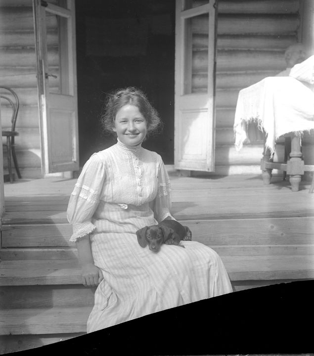 Любовь Зевеке сидит на крыльце дома со щенком на коленях. Автор: В.А. Зевеке Место события: г. Н.Новгород Дата: к. XIX - нач. ХХ вв.