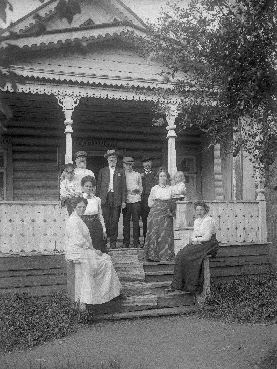 Группа людей на крыльце дома. Вторая слева – Л.Д. Зевеке с сыном Георгием. Нижний Новгород.