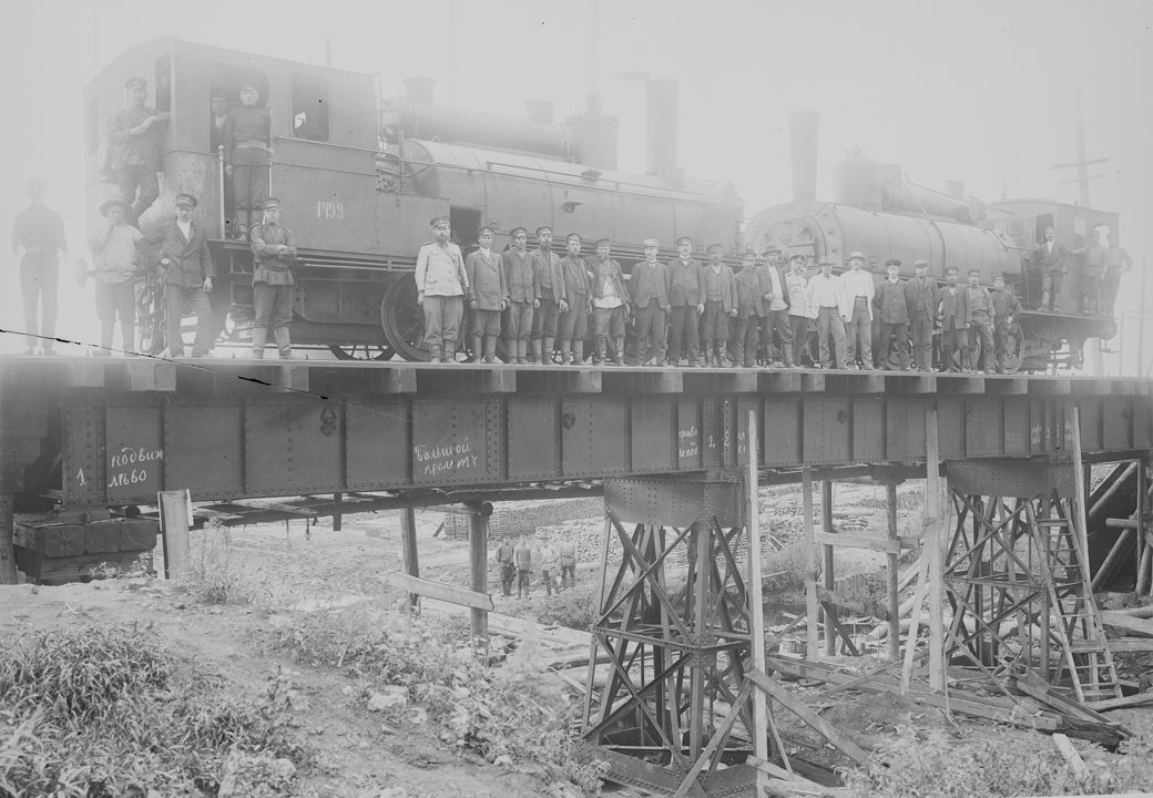 Сормово завод №112. Железнодорожный мост от центра завода на берег. Портрет мастеров. Дата: 1907 г. Место съемки: г. Н.Новгород Автор: М.П.