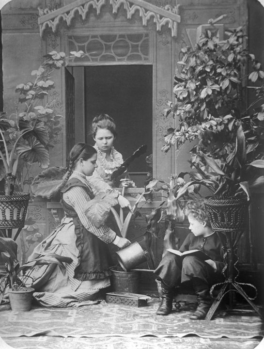 Групповой снимок: Пелагея Васильевна Дзержинская поливает цветы, справа – Андрей Карелин с книгой, у окна – Людмила Карелина. Автор: А.О. Карелин Место события: г. Н.Новгород Дата: к. ХIХ в.