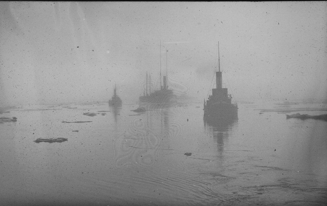 Вид на караван судов в Карском море. На воде льдины. Автор: В.А. Зевеке Место события: Карское море Дата: 23 августа - 1 сентября 1914 г.