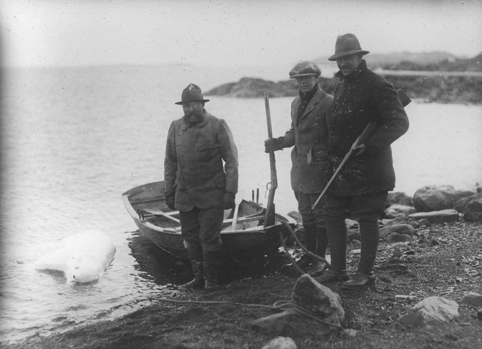 Групповой снимок. Слева направо: Отто Свердруп, норвежский полярный исследователь, Ханневиг, капитан «Гертруда Гилле», Иоган Лид, директор-распорядитель Сибирского акционерного общества, во время охоты на белых медведей на острове Диксон.