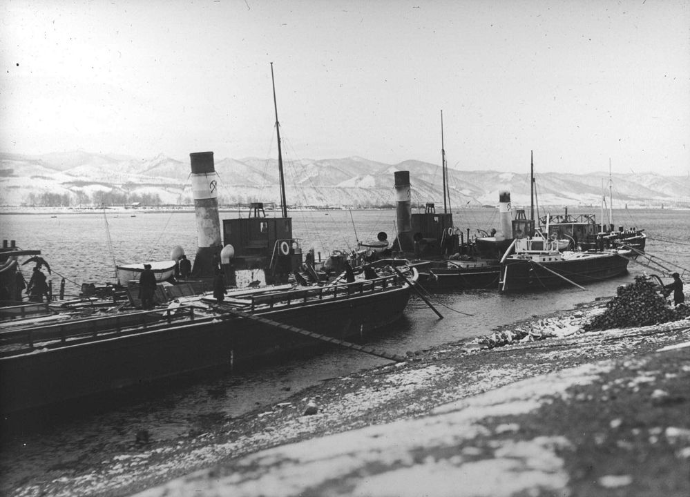 Вид на пароходы, пришвартованные у берега г. Красноярска. Автор: В.А. Зевеке Место события: г. Красноярск Дата: 29 сентября - 12 октября 1914 г.
