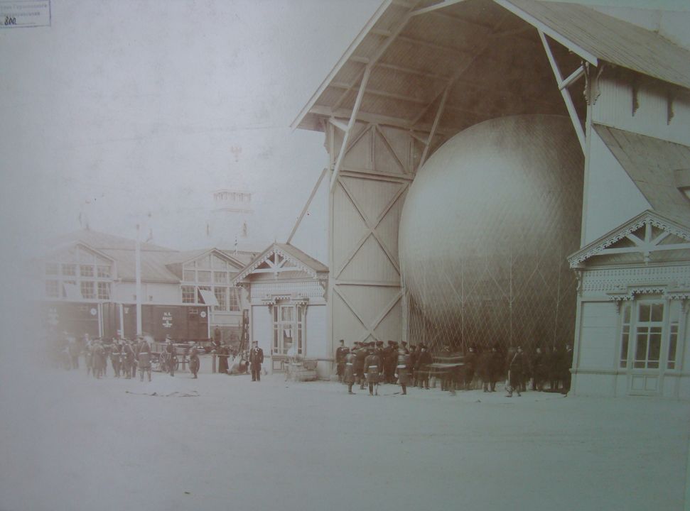 Визит Николая II на Всероссийскую промышленно-художественную выставку. Николай II со свитой при осмотре воздухоплавательного парка на выставке. Дата: 1896 г. Место съемки: г. Н.Новгород Автор: М.П. Дмитриев