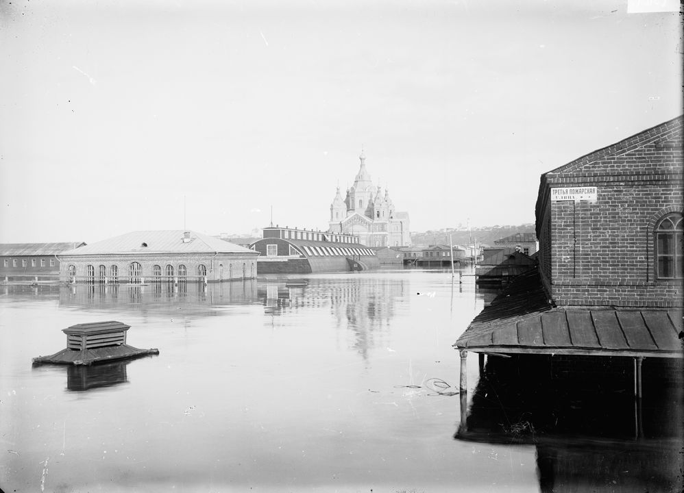 Нижегородская ярмарка во время половодья. Вид на Александро-Невский собор. Нижний Новгород.