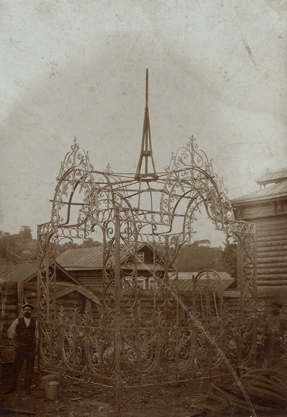 Фотограф неизвестен. Село Павлово, Горбатовский уезд. Кузнец Иван Алексеевич Боронин (1886-1931) на фоне кованой ограды. Начало ХХ в.