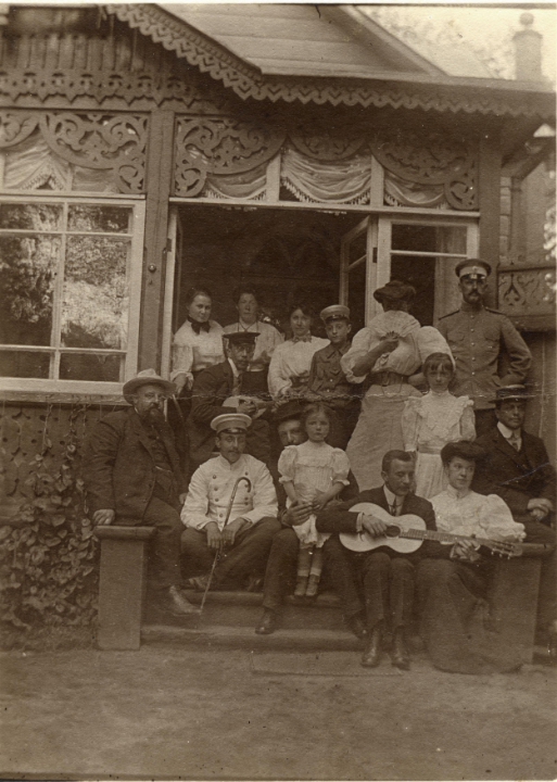 Наталия Павловна Дурдина на лестнице перед домом с неизвестными мужчинами и женщинами