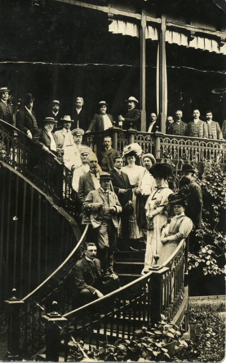 Наталия Павловна и Владимир Иванович Дурдины на высокой витой лестнице среди мужчин и женщин