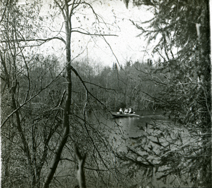 Группа людей в лодке, плывущей по реке (вдалеке)