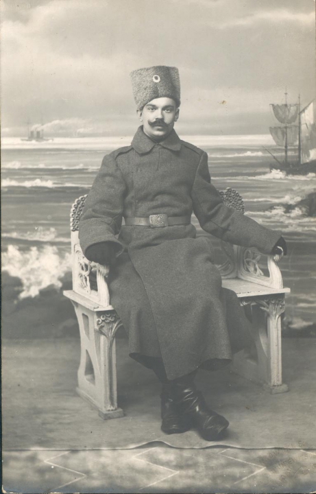 А.Владычук, конторщик фарфоровой фабрики Кузнецова в поселке Песочное в военной форме солдата