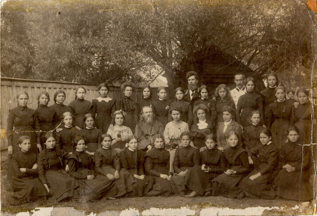 Наталия Павловна Дурдина с матерью и неизвестными женщинами у лестницы перед домом