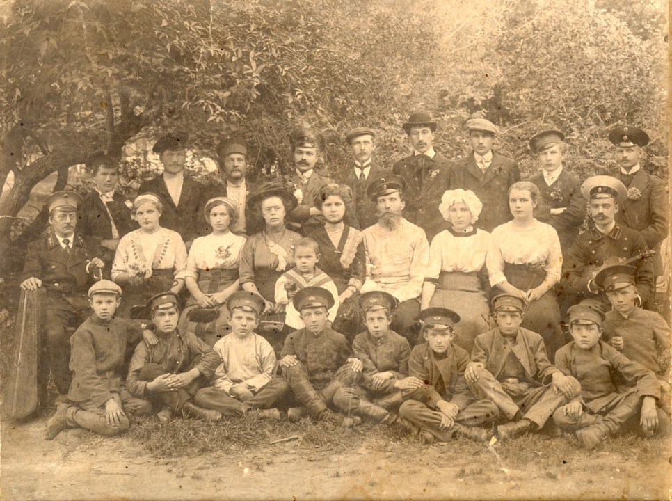Наталия Павловна Дурдина с матерью и неизвестными женщинами у лестницы перед домом