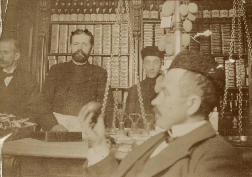 Группа мужчин у прилавка торговой лавки